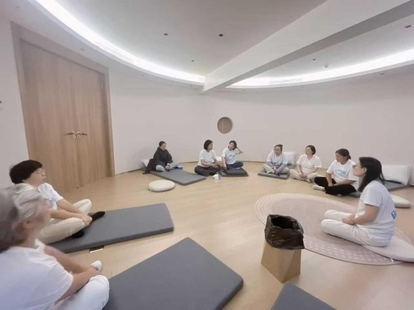 课程当天,尽管新学员仅5人,但她却交出了一份满意的答卷:冥想环节,她不再机械背诵流程,而是随心流淌,用有穿透力的声音引导学员下沉潜意识;互动分享时,她精准捕捉每位学员的情绪需求,用专业回应搭建信任桥梁;核心呼吸疗愈环节,她与肖霞、菊梅、胡颖三位助教默契配合,为学员提供深度支持