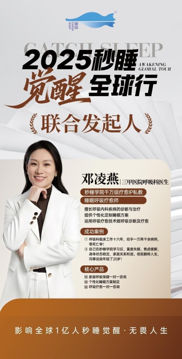 我们期待,在秒睡学院的支持下,邓凌燕能带着她的专业与热爱,帮助更多人通过呼吸疗愈改善睡眠、穿越情绪卡点,真正实现“秒睡觉醒,无畏人生”!
