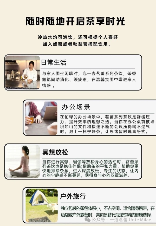天然有机 :一道茗蕾Unté Milaé 在天然植物茶饮的基础上率先推行有机理念,产品以天然植物成分为基础,如甘肃陇南党参、黄芪、安徽贡菊、河南焦作淮山等,不使用基因改造种子幼苗,养殖过程中不用化学农药、杀虫剂等。