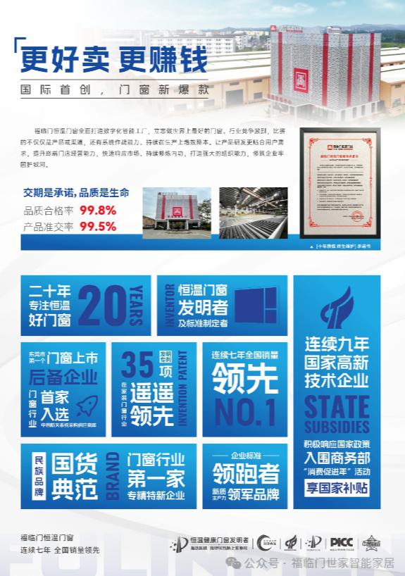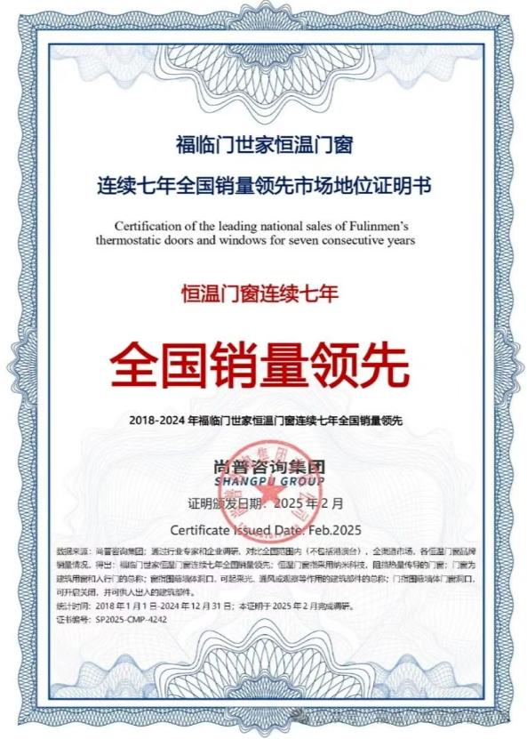 福临门恒温门窗能够获得“门窗企业一线品牌TOP 10”,也离不开其多年的积累与沉淀。该品牌连续七年保持全国销量领先,这一成就的背后,是消费者对其产品品质和服务的高度认可。这一荣誉不仅是对其过往成绩的肯定,更为其未来的发展注入了强大的动力。