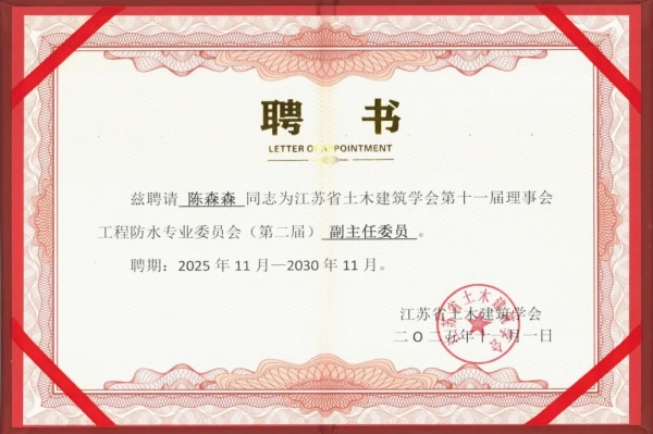 南京康泰建筑灌浆科技有限公司总经理、教授级高级工程师陈森森,凭借在堵漏灌浆领域的深厚技术造诣、丰富行业经验及广泛行业影响力,成功当选为新一届工程防水专业委员会副主任委员。
