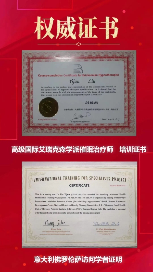 后作为中南大学的代表专家参与了精神心理学的全国流行病学调查,2014年通过国家卫健委的选拔,得到了在意大利佛罗伦萨卫生署访学三个月的机会,也拿到了“高级国际艾瑞克森学派催眠治疗师”等权威证书。