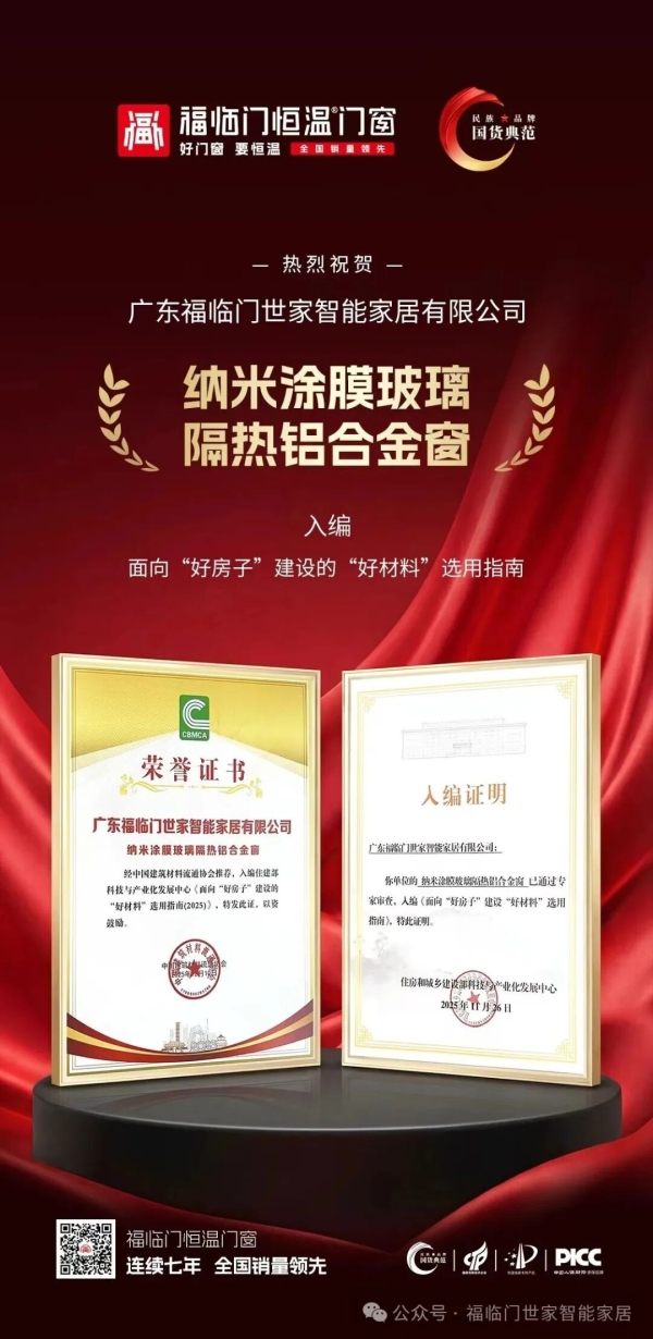 近日,广东福临门世家智能家居有限公司喜传捷报——其核心产品纳米涂膜玻璃隔热铝合金窗(福临门恒温门窗),凭借卓越的技术性能与行业影响力,顺利通过住房和城乡建设部科技与产业化发展中心专家严格审查,成功入编《面向“好房子”建设“好材料”选用指南》(以下简称《指南》)。这一国家级权威认证,不仅是对福临门恒温门窗技术实力的高度认可,更标志着其在推动绿色建筑高质量发展、助力“双碳”目标实现中迈出了坚实一步。