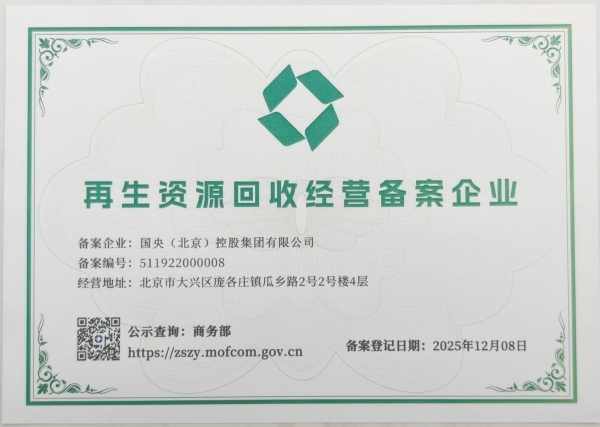 近日,国央(北京)控股集团有限公司(以下简称“国央控股”)正式通过中华人民共和国商务部再生资源回收经营者备案,取得备案证书及官方牌匾(备案号:511922000008)。这标志着由国央控股主导研发并推广的“火箭绿醇”绿色甲醇清洁能源业务,已全面纳入国家再生资源统一监管体系,为在全国范围内建设“平