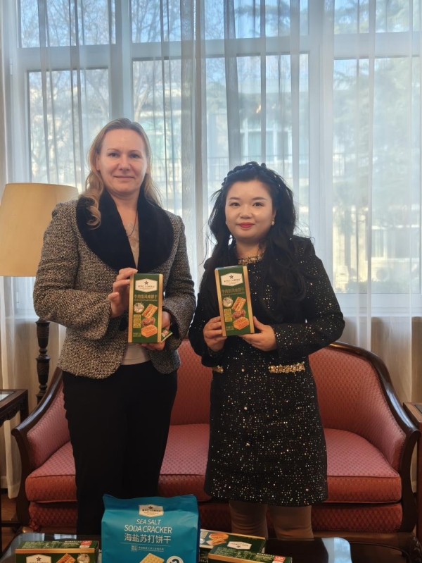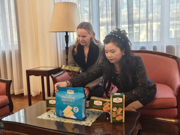 塞尔维亚共和国驻华大使馆参赞碧莲娜·伊万尼奇仔细观察饼干的质地与外观,然后取出一块轻轻品尝。她的表情从认真逐渐转为赞赏,显然,这款饼干的口感和风味给她留下了深刻印象。