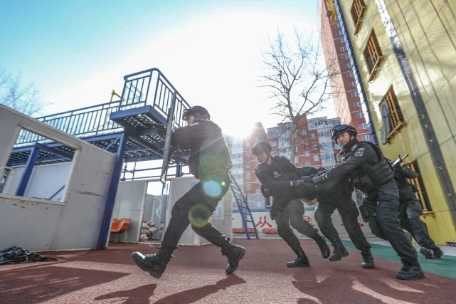 为了护航春运,北京铁路公安处特警支队的特警们近日分批开展了冬季训练,包括体能、搏击、战术、攀登、排爆、狙击、柔道等多种实战科目,还进行了一系列实战演练。