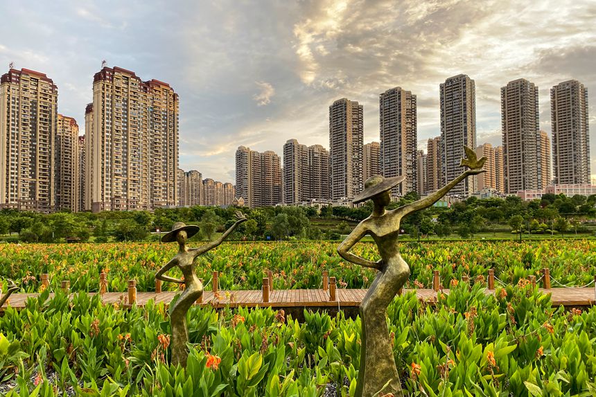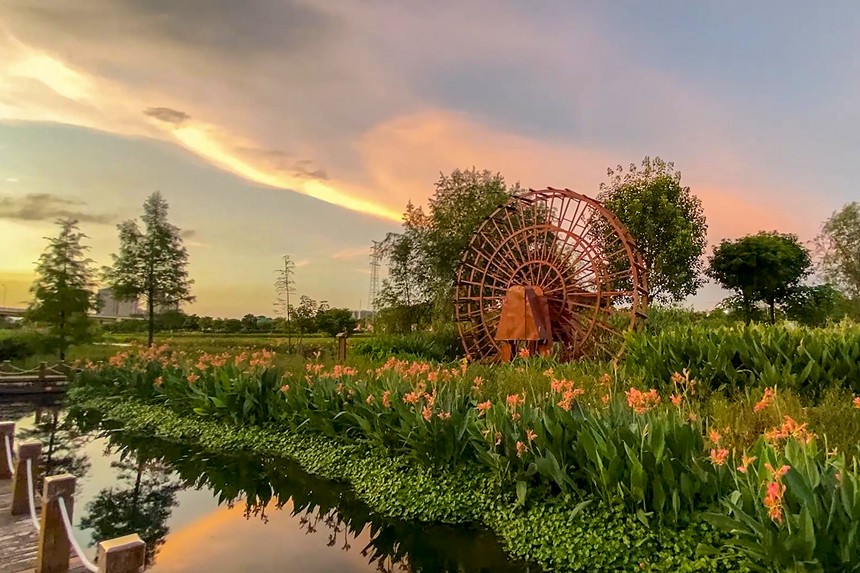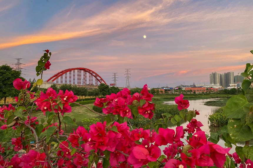 初冬时节,落日的余晖映照在南宁市那考河湿地公园,那考河的碧波清水与岸边喜阳生长的美人蕉互相衬托,熠熠生辉。此时圆月自东边悄悄升起,东边的天空呈现粉蓝色,如梦如幻,宛如童话世界。西边的天空被染成火焰般的橘红色,犹如美丽的丝绸。漫步那考河畔,沐浴着温柔霞光,风也醉人。(覃伟钊)