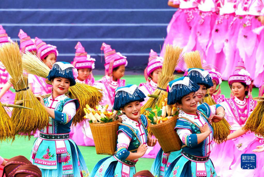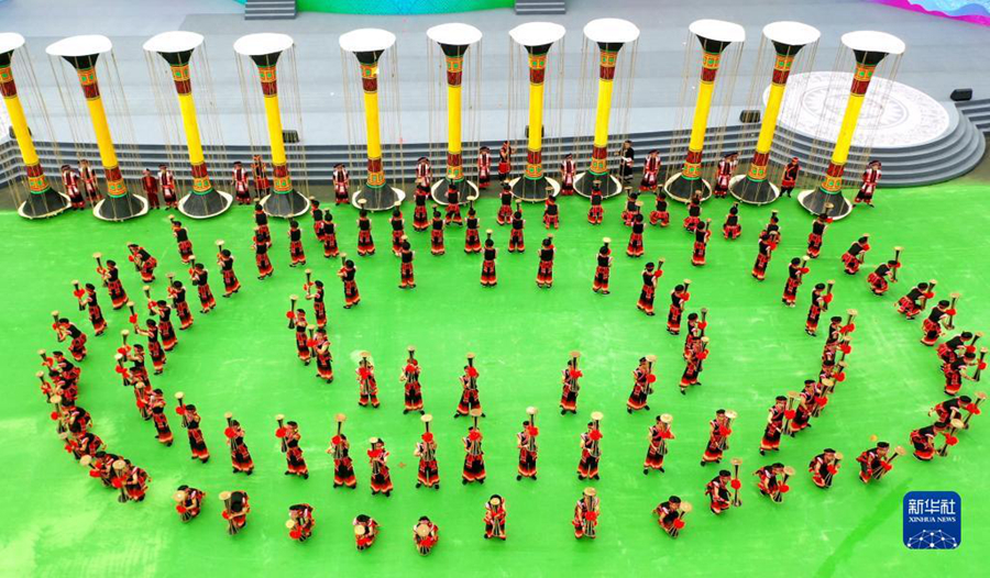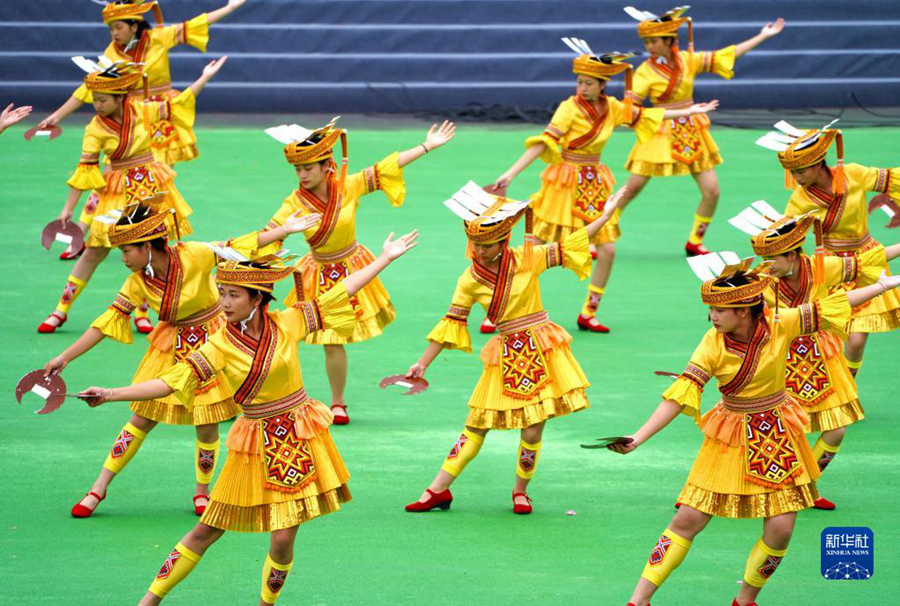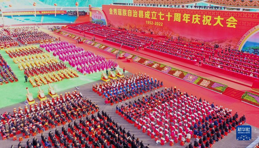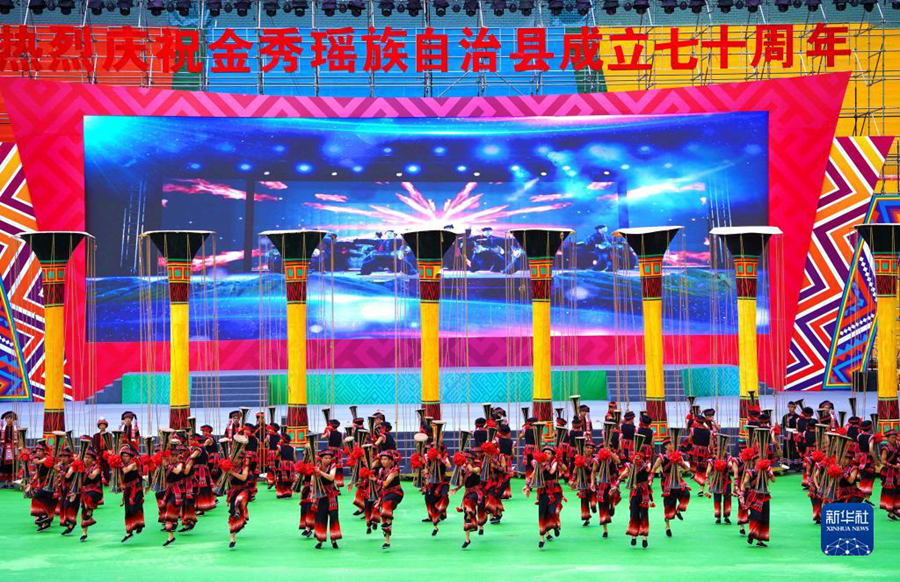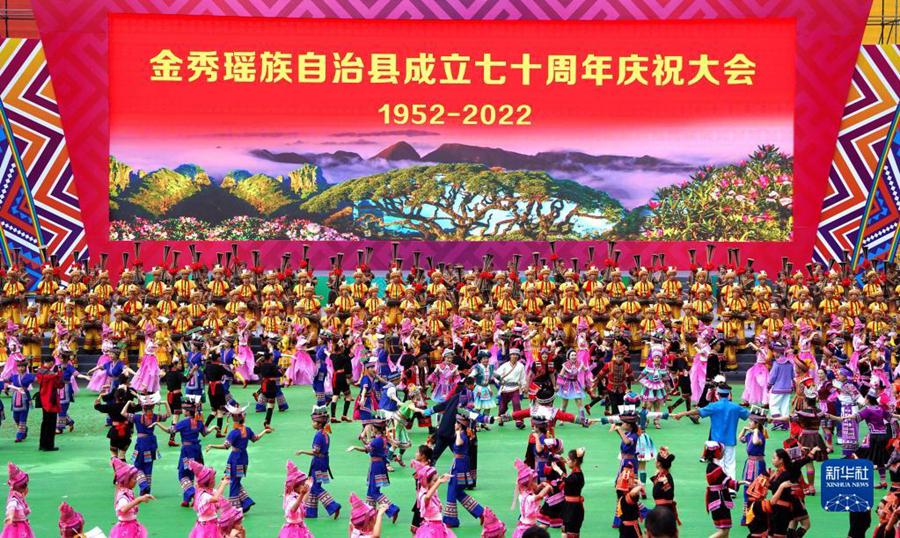 11月28日,广西金秀瑶族自治县举行自治县成立70周年庆祝大会,当地各族同胞载歌载舞庆县庆。(高如金 摄)
