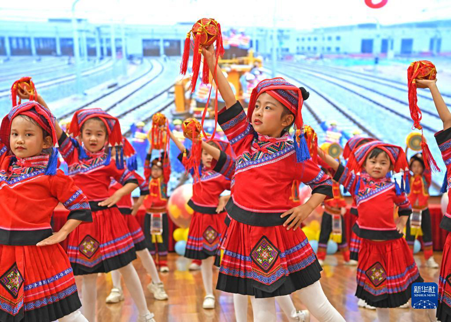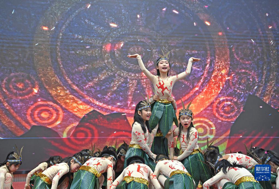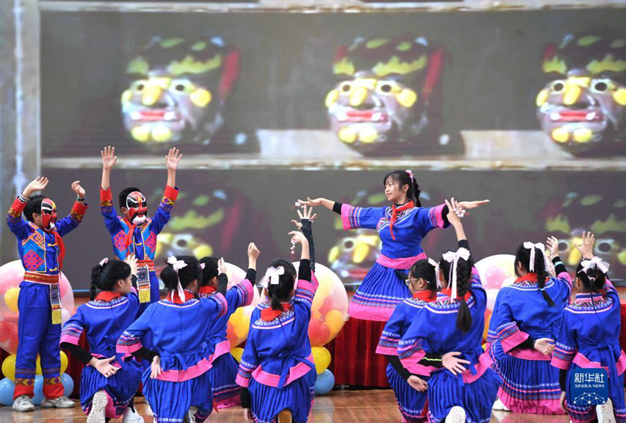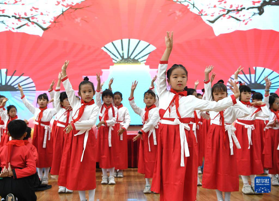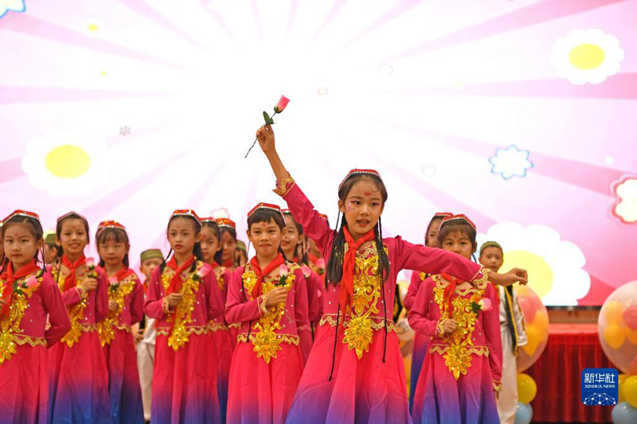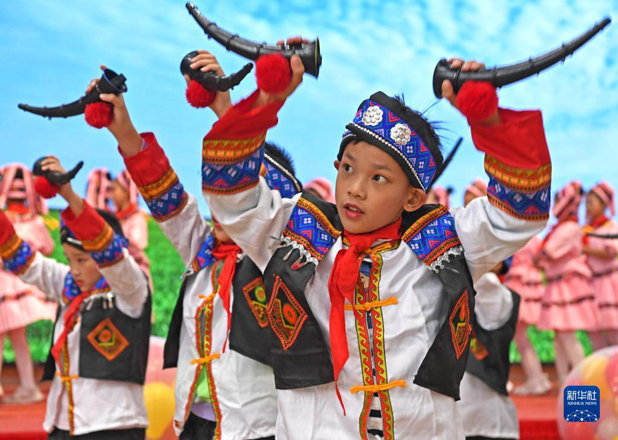 当日,广西南宁市玉兰路小学举行主题为“石榴花开一家亲 同心共筑中国梦”的体育节。开幕式上,孩子们表演民族舞蹈,体验传统文化,共度欢乐时光。(新华社记者 周华 摄)