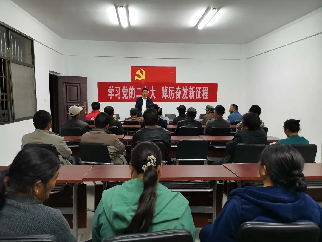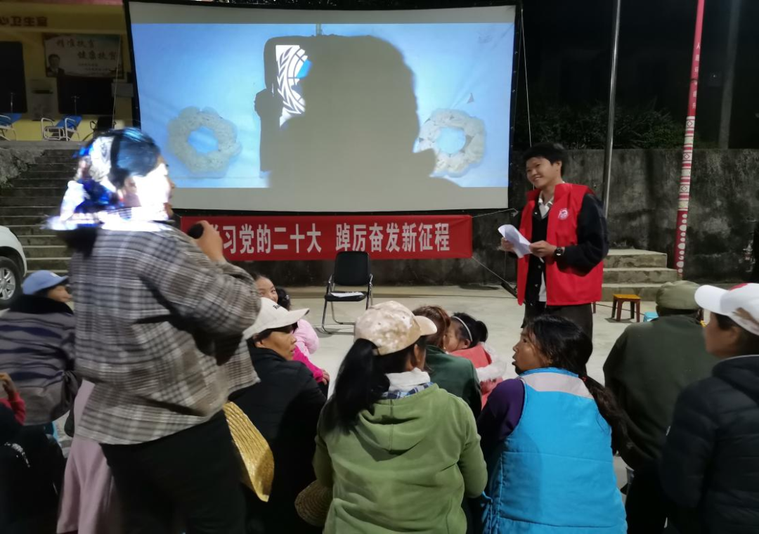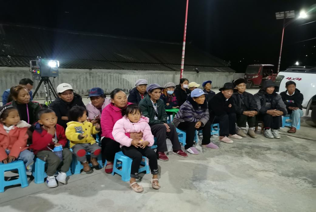 11月14日傍晚,怒江州泸水市大练地街道大练地村一、二组的村民们早早来到放映点,电影还没开场,在大练地村党群活动室的场地上,几张小木椅,一块不大的活动场地上,笑声掌声不断。大练地街道主任杨李兴与大练地村村支两委、驻村工作队和20余村民围坐一起,一场学政策、拉家常、听诉求、接地气的党的二十大精神宣讲活动正在进行。