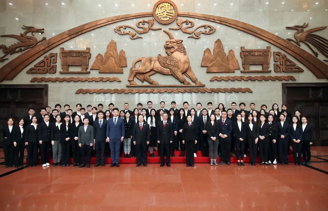 图为周强、贺荣、马世忠同第六批实践锻炼青年学者、第十一批法律实习生合影。