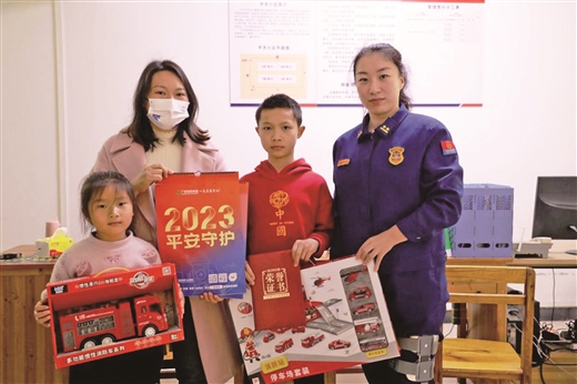 贵港消防为江先国(红衣少年)送去荣誉证书和礼物。贵港市消防救援支队供图