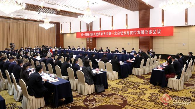 3月9日下午,出席十四届全国人大一次会议的云南省代表团举行全体会议,审议有关草案,酝酿协商国家机构组成人员人选。
