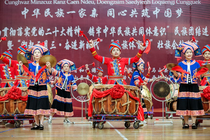 5月10日上午,南宁市马山县2023年“全面贯彻落实党的二十大精神,铸牢中华民族共同体意识”民族团结进步宣传月启动仪式暨“潮起三月三·奋进新时代”“民族体育炫”壮族会鼓大赛在马山县体育馆举行。