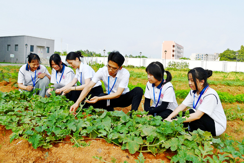 钟山县第三高级中学师生在学校劳动教育基地商讨蔬菜种植技术。廖超文摄
