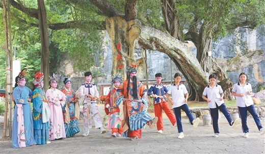 6月9日,桂林市平乐县青龙乡平西村老年桂剧团给当地小学生传授桂剧技艺,让优秀传统文化代代相传。苏桂 摄