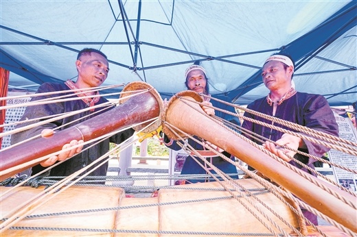 6月10日,2023年来宾市金秀“文化和自然遗产日——非遗集市”在罗香乡罗运村举行,现场邀请非遗传承人展示非遗技艺。图为国家级非遗项目黄泥鼓制作技艺展示。高如金 摄