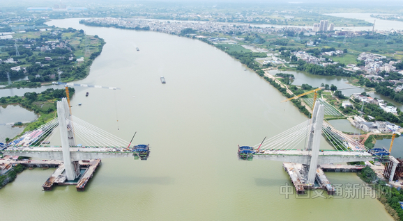 近日,广西南玉铁路六景郁江特大桥主塔封顶,工人们正安装箱梁,预计今年11月底实现大桥合龙(如图)。