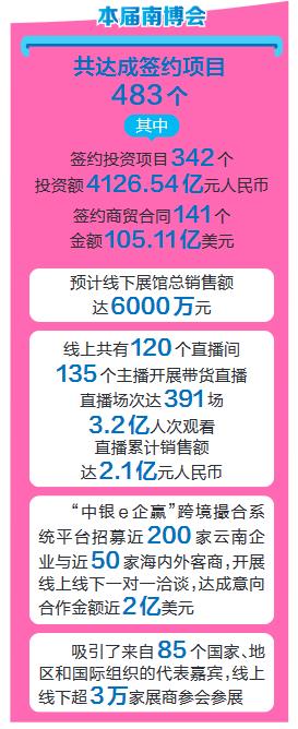 本届南博会共设置15个展馆,围绕“3815”战略发展目标和省委、省政府重大工作部署,首次设置资源经济馆、口岸经济馆、园区经济馆、区域合作馆4个展馆。展览面积15万平方米,共有2050家企业、10063人线下参展,设置310个特装展位,特装比例达到79.68%,89家世界500强企业、42家中国500强企业及68家境内外行业龙头企业线下参展参会,参展国家(地区)数量位居全国同类展会前列,世界和中国两类“500强”企业参展参会数量创历届南博会新高。共达成签约项目483个,其中,签约投资项目342个,投资额4126.54亿元人民币,同比增长2.2%;签约商贸合同141个,金额105.11亿美元,同比增长3.9%。“中银e企赢”跨境撮合系统平台招募近200家云南企业与近50家海内外客商,开展线上线下一对一洽谈,达成意向合作金额近2亿美元。本届南博会首日销售额达到327万元,第2天即破千万大关,预计线下展馆总销售额达6000万元。投资签约、商贸合同、现场交易数据,均大幅超过疫情前水平。