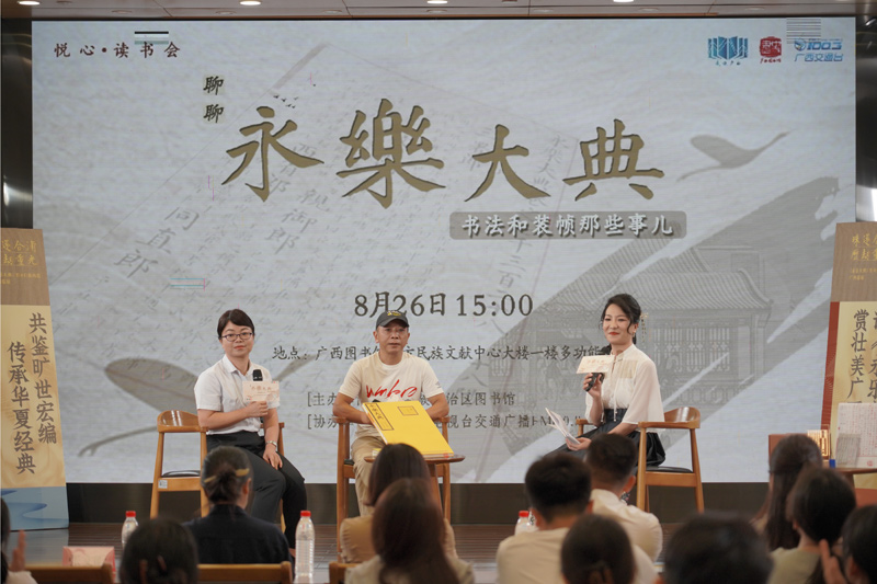 《永乐大典》是中华民族历史上规模最大的类书,也是中国古代最大的“百科全书”。《永乐大典》在装帧和书法上都极为讲究,皆用明黄色丝绢包面,开本阔大。全书正文用明代官用楷书“台阁体”抄写,书法秀丽工整,还配有大量插图,形象逼真。读书会以《永乐大典》的装帧方式和抄写字体为切入点,邀请广西民族出版社美术编辑设计中心主任张文昕、广西艺术学院中国画学院书法系副主任赵雪飞及广西图书馆馆员、“珠还合浦历劫重光——《永乐大典》的回归和再造”广西巡展讲解员谭碧雁、陈虹锦作为分享嘉宾。