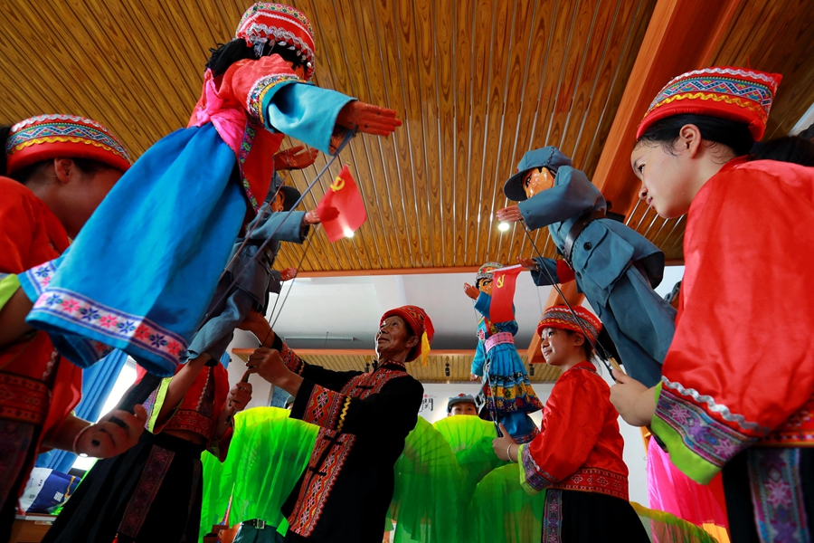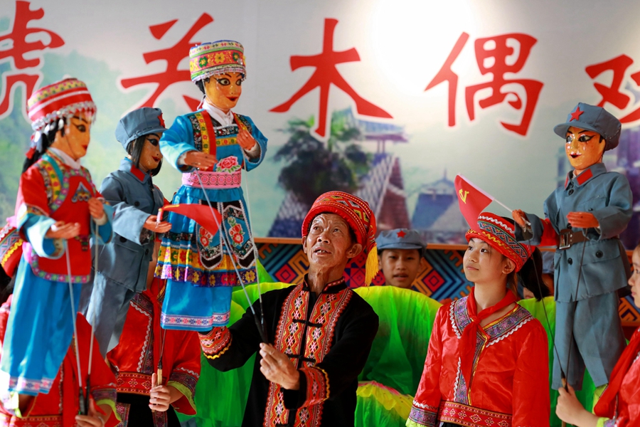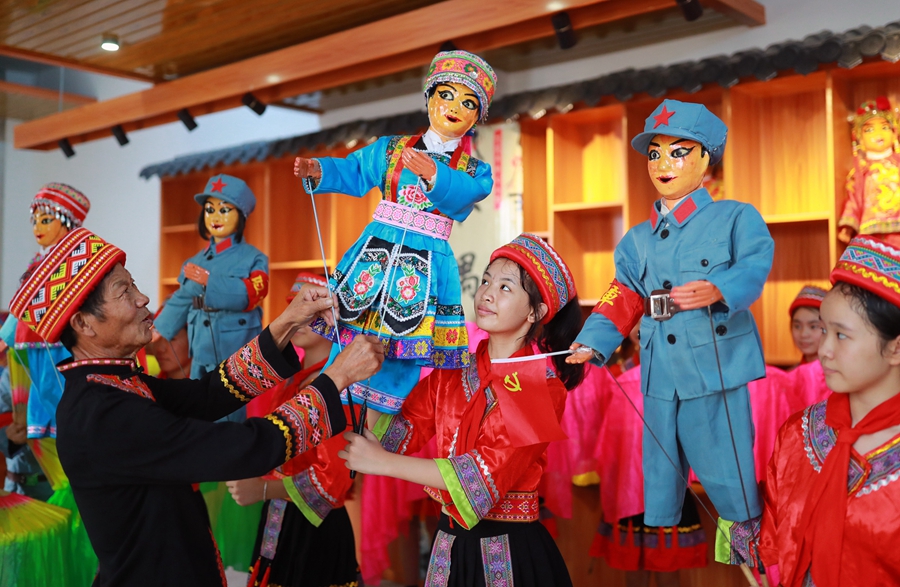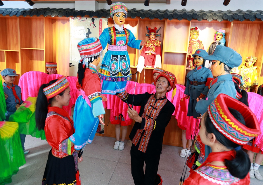 近日,在桂林市恭城瑶族自治县龙虎乡龙虎中心小学,木偶戏非遗传承人、志愿者王吉财,正在义务指导小学生排练有关乡风文明的木偶剧。近年来,恭城瑶族自治县深化志愿服务体制,在全县建立了 127 个新时代文明实践站,成立了 600 多支志愿服务队,约 5 万注册志愿者经常深入乡村、企业、社区和学校等地,开展乡风文明、医疗健康、森林防火等志愿服务活动 8 万余场次,惠及群众 42 万多人次,大力培育了文明乡风。(刘教清 陈忠良)