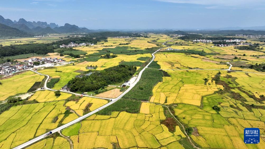 深秋时节,广西柳州市柳城县古砦仫佬族乡的晚稻丰收在望,金黄的稻田、起伏的山脉与错落的民居构成一幅秀丽的田园丰收画。(新华社发 黎寒池 摄)