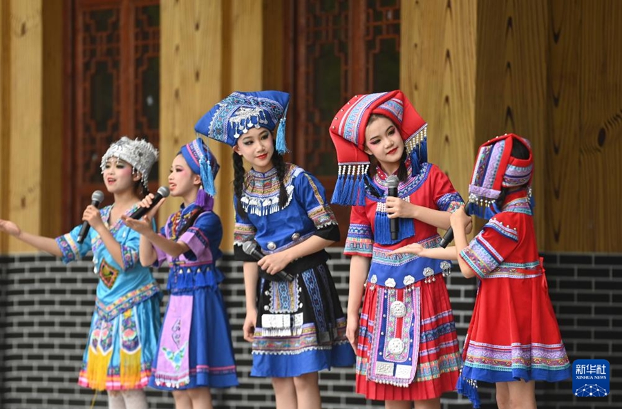 3月25日,在梧州市苍梧县六堡镇山坪村,中小学生在开茶节里唱山歌。