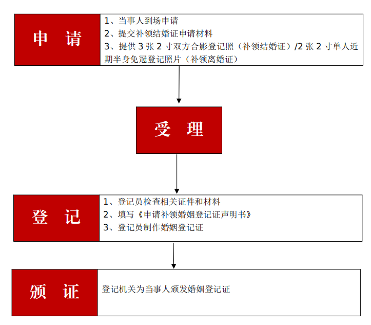 证件及证明材料齐全、有效,且符合补领结婚证条件的,按照“申请-受理-登记-颁证”的程序办理。