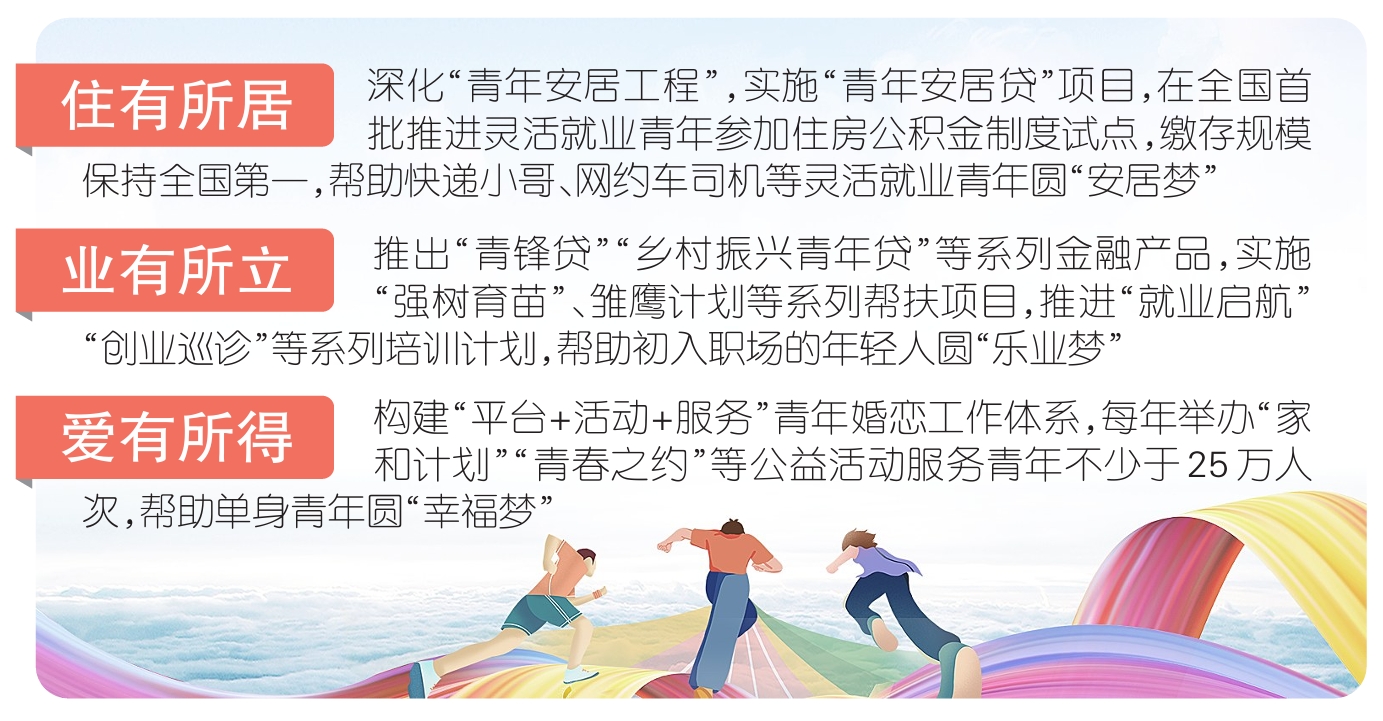 张珂称,重庆的惠青政策更是实实在在的“干货”。围绕住有所居,深化“青年安居工程”,实施“青年安居贷”项目,在全国首批推进灵活就业青年参加住房公积金制度试点,缴存规模保持全国第一,帮助快递小哥、网约车司机等灵活就业青年圆“安居梦”;围绕业有所立,推出“青锋贷”“乡村振兴青年贷”等系列金融产品,实施“强树育苗”、雏鹰计划等系列帮扶项目,推进“就业启航”“创业巡诊”等系列培训计划,帮助初入职场的年轻人圆“乐业梦”;围绕爱有所得,构建“平台+活动+服务”青年婚恋工作体系,每年举办“家和计划”“青春之约”等公益活动服务青年不少于25万人次,帮助单身青年圆“幸福梦”。