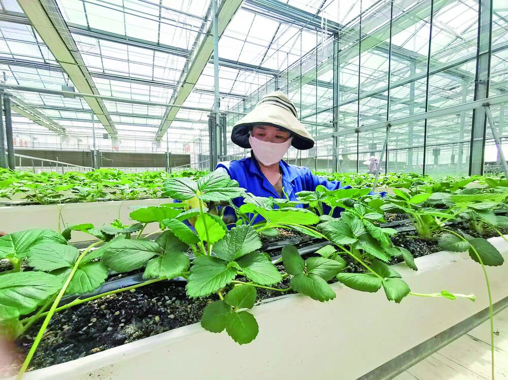 走进草莓脱毒育苗中心,一排排青翠的草莓苗整齐排列在育苗架上。村民李秀珍穿行在苗架之间,仔细打理着草莓苗。“发黄的叶子要掐掉,长了的草莓苗要让它垂在苗架外侧……”李秀珍已经在育苗中心工作了2年,每月有3000元的收入。