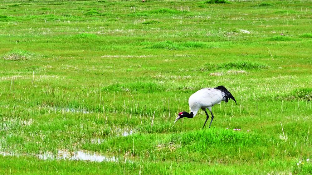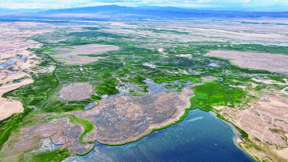 6月12日,在位于海西蒙古族藏族自治州乌兰县的金子海国家沙漠公园,蓝天、碧水、草原与沙丘共同构成一幅壮丽的生态风景图。水鸟时而在波光粼粼的湖面上成群结队、展翅飞翔,时而“藏”在芦苇丛中“窃窃私语”,时而漫步湿地、悠闲觅食……