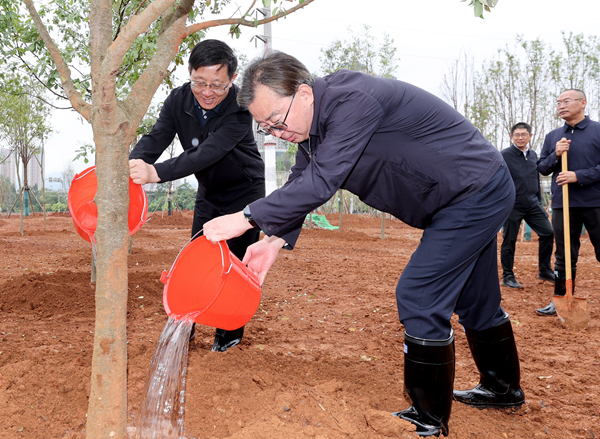 随后,省领导三五一组,挥锹铲土、培土围堰、提水浇灌,合力栽下滇青冈、头状四照花等树苗,增添一片新绿。