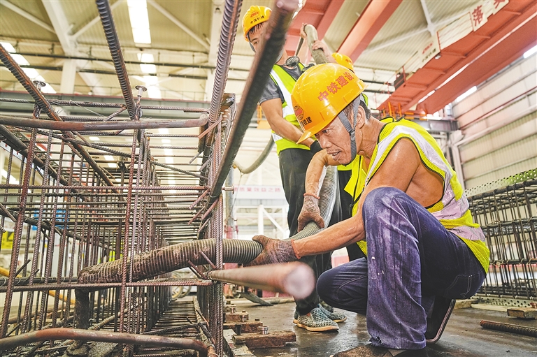 近日,在临高金牌港开发区的装配式建筑生产车间,工人正在进行装配式建筑产品的浇筑生产。海南日报全媒体记者 封烁 摄