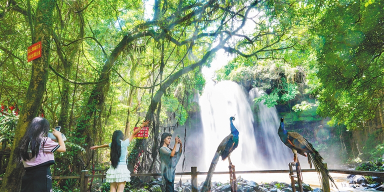 7月12日,位于临高县皇桐镇居仁村西部的古银瀑布景区,瀑布景观壮美。时下正值雨季,瀑布迎来丰水期,吸引暑期游客前来观光打卡。