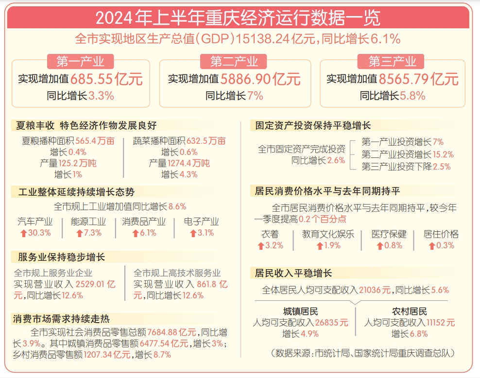 7月19日,市统计局、国家统计局重庆调查总队公布2024年上半年重庆经济发展运行数据,全市实现地区生产总值(GDP)15138.24亿元,同比增长6.1%。其中,第一产业实现增加值685.55亿元,同比增长3.3%;第二产业实现增加值5886.90亿元,同比增长7%;第三产业实现增加值8565.79亿元,同比增长5.8%。