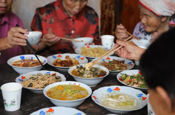 深山内,一个不算大的院坝里,一群老人坐在一起,杯、碗、筷的碰撞声和欢笑声,越过青瓦一房又一房。