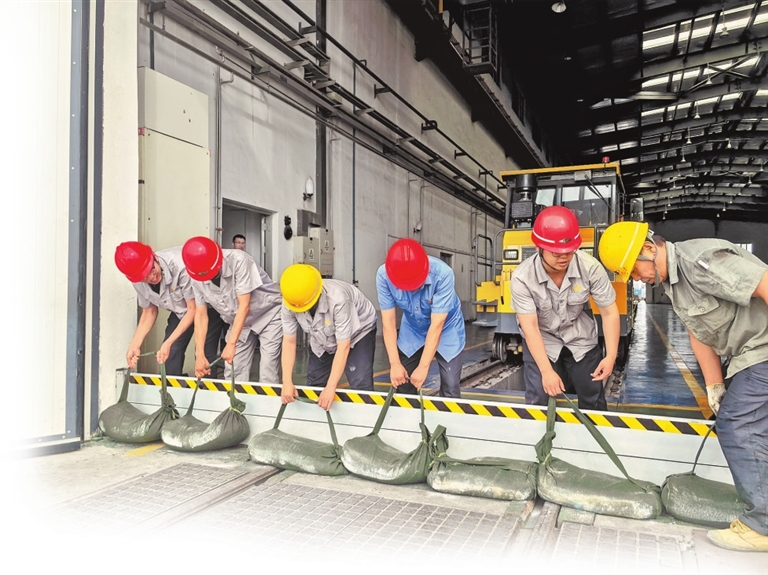 7月26日,国铁郑州局新乡机务段使用挡水板、沙袋等,封堵其管辖的检修库。(王铮 刘瑜 摄)
